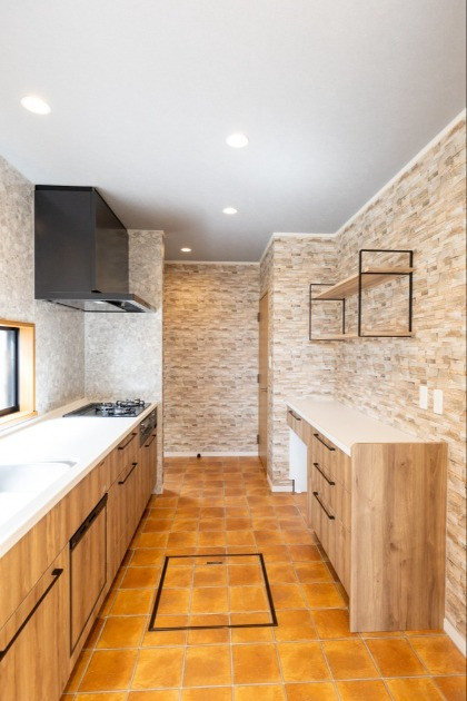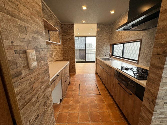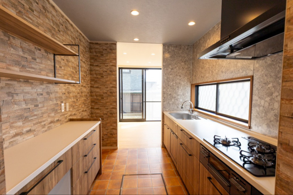 レンガ調のアクセントウォールと温かみのある木目調のキャビネットが美しく調和し、カフェのような落ち着いた空間を演出。シンプルなカウンターやオープンシェルフが、素材感を活かした洗練された印象を与えています。十分な収納スペースと、シンク・コンロ間に確保された広い作業スペースにより、毎日の家事動線がスムーズに。横長窓で採光と換気を確保しつつ、ダウンライトで明るく快適な作業環境を実現しています。