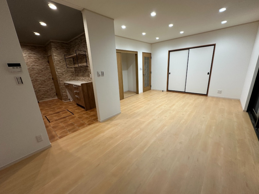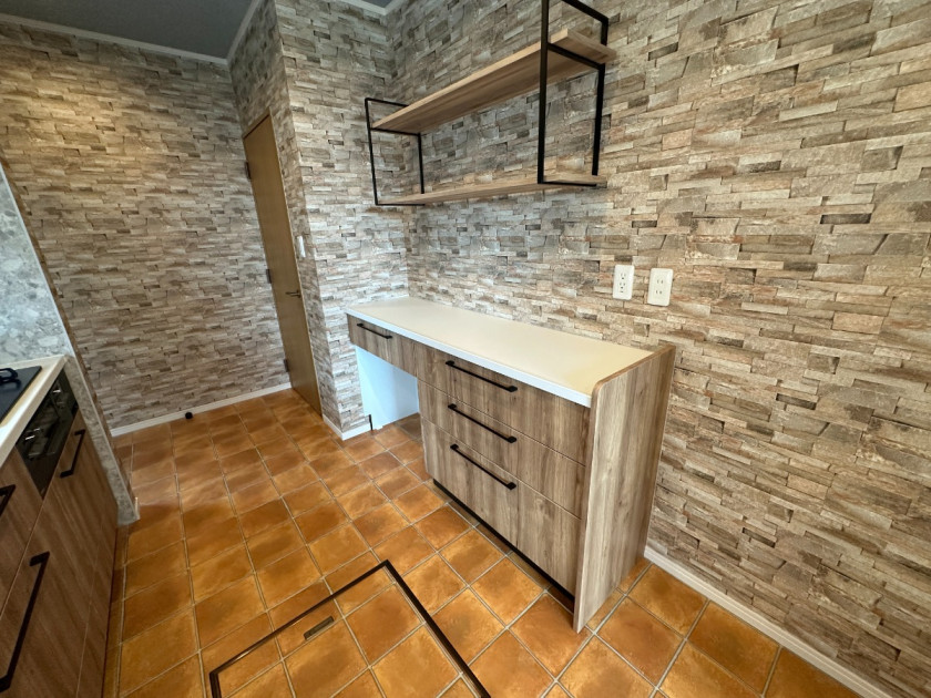 工事前のシンプルな空間から一変し、温かみのある素材と洗練されたデザインが見事に融合した、理想のキッチン空間が誕生しました。 足元には暖色系のテラコッタ調の床材を敷き詰め、空間全体に優しい温もりを与えています。機能面でも、最新のレンジフードや使いやすいガスコンロを導入。広い作業スペースと充実した収納で、毎日の料理が格段に快適になる想定。天井のダウンライトや窓から差し込む光が、この居心地の良い空間を明るく照らしています。