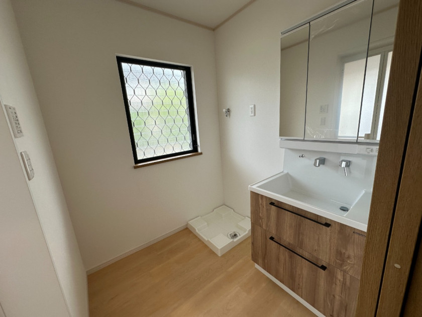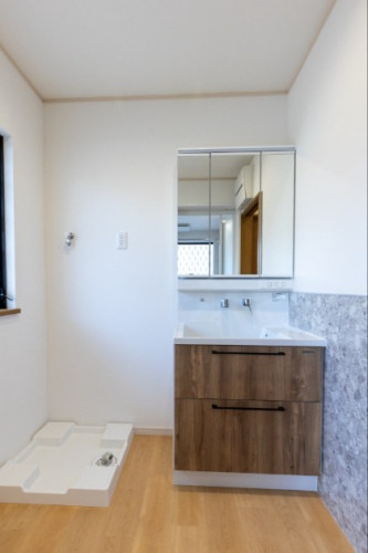 洗面所のリフォームでは、水濡れで腐食していた床を補修し、耐水性の高い床材に張り替えて防水パンを設置することで衛生面と耐久性を根本的に強化しました。さらに、洗面化粧台を三面鏡(鏡裏収納)と引き出しタイプに交換し、収納力と清掃性を大幅に向上させるとともに、木目調のキャビネットでモダンかつ温かい雰囲気に刷新しました。