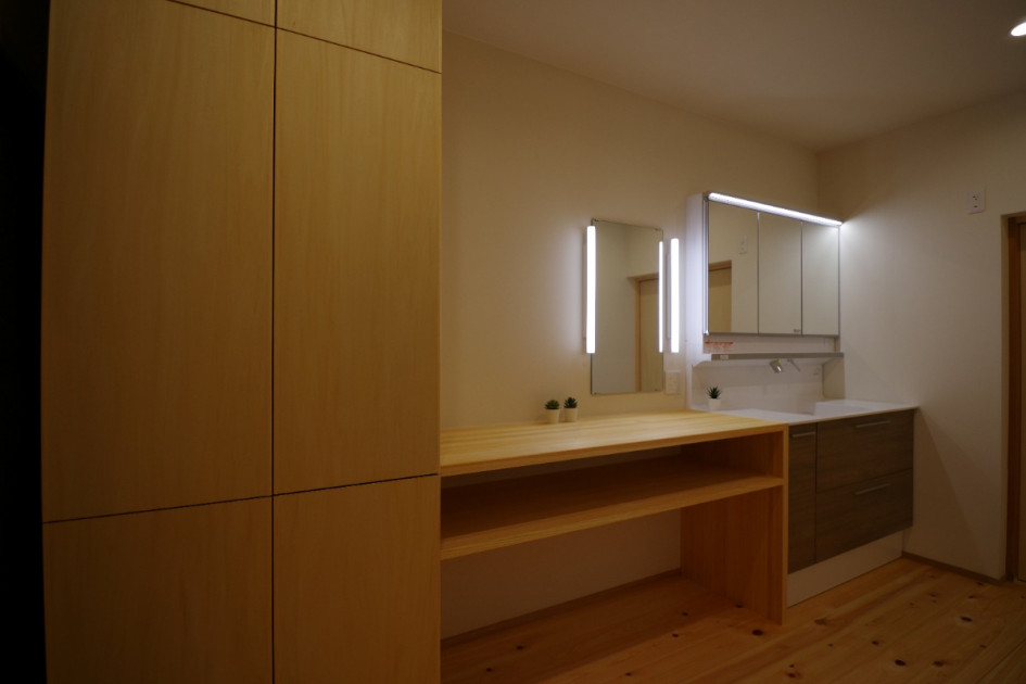 リノベーションにより広々とした収納とカウンター付きの洗面室となりました。