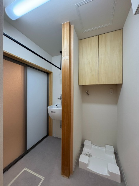 洗濯機も脱衣室に設置。深型流しも設置してハードな汚れものも室内で洗えるようになった。