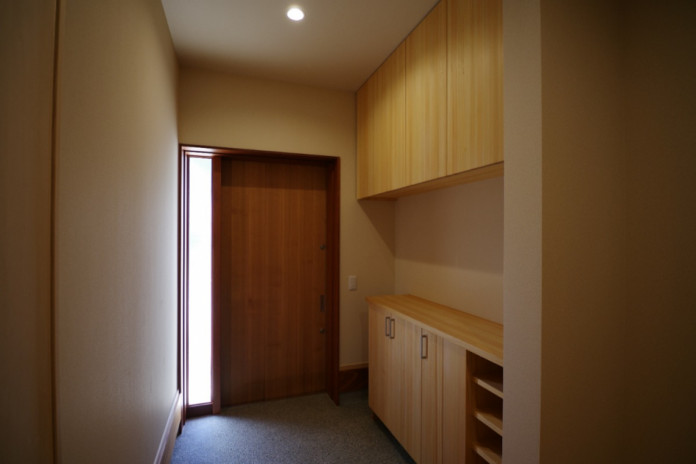 勝手口を玄関に改修。玄関戸、下駄箱共に自社オリジナルの造作。玄関戸は断熱材の挟み込みや気密パッキンの取り付けなど断熱性、気密性にもこだわって製作した。
