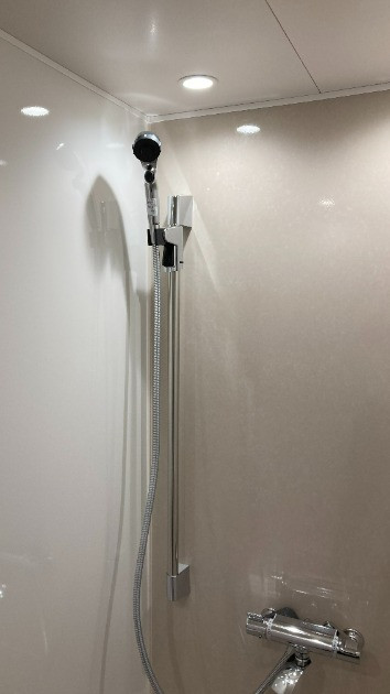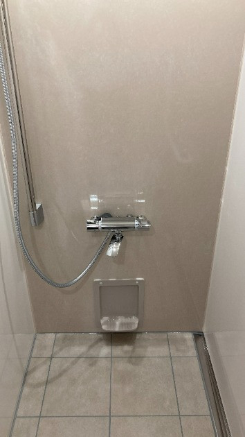 壁はホーロークリーンパネル、床はキープクリーンフロア仕様の傷つきにくい丈夫な床。何より耐久性と汚れが落ちやすくお掃除が楽なところが決め手となりました。シャワールームの有効幅は900㎜幅を確保しています。