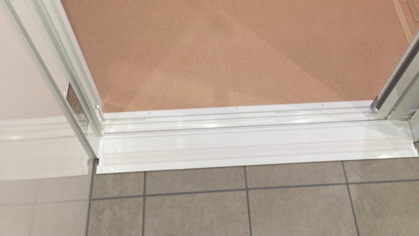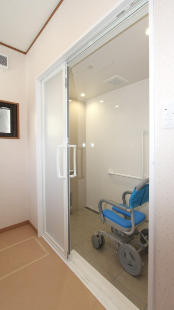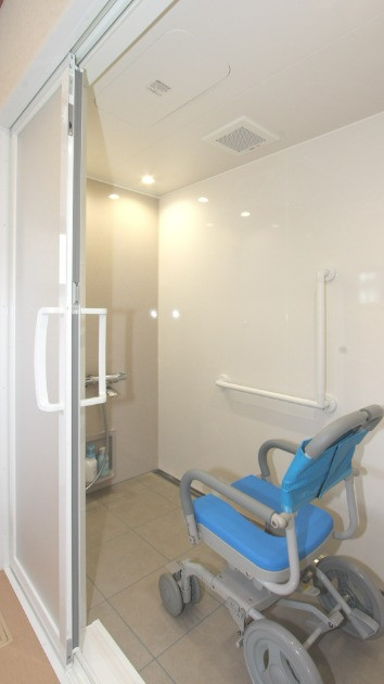 シャワールームの出入口ドアは、車いすが移動しやすく、また回転スペースも取れる有効開口の広い2枚引戸を採用しました。