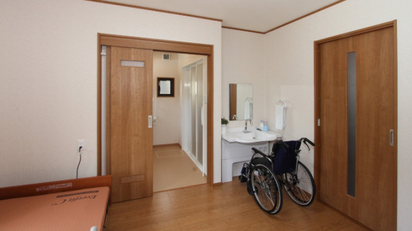 和室6帖部分をお父様の『寝室』に、一角には車いすで使用できる洗面化粧台を配置。奥の納戸部分を『シャワールーム・サニタリールーム』へと改修しました。寝室からLDKへも楽に移動できます。
