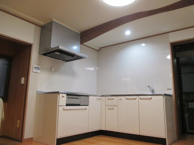 土間の台所は居間から降りたりあがったりと冬は寒く歳をかさねていくと体に負担がかかってくると思います。和室と居間を1部屋にダイニングとしてL型キッチンで広く使えるように間取り変更しました。フロアーはその他の隣接する和室のたたみの高さに合わせてバリアフリーに施工しました。ガス機器もIHに変えて安全でお手入れしやすいものとしました。