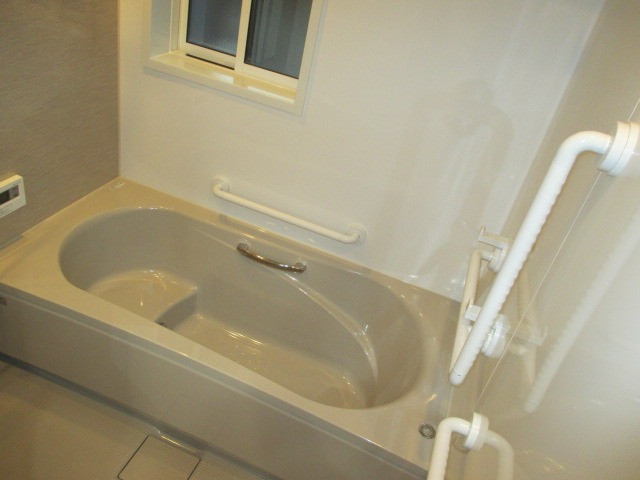 居間を出て土間に降りての浴室はタイル張りの浴室で特に冬は寒いお風呂でした。とにかくいつも過ごす部屋からの段差無く行き来でき、高断熱の浴槽に冬場は浴室暖房乾燥機を取り付けたことでヒートショックの防止にもなりました。手すりもシャワーフックスライドバーも手すり仕様に浴槽横、背面にはL型てすりを取付一人でも安心して入浴できます。ホーローパネルはとてもお手入れ簡単で家事らくです。