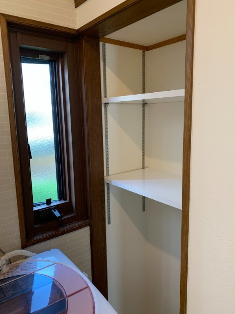 洗面台の幅がコンパクトになったことにより、もともと洗面室にあった物入内に可動棚を取り付け、物入収納をフル活用できるようにしました。