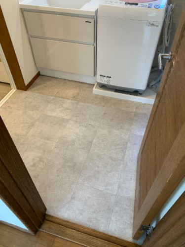 床クッションフロアは薄いグレーのタイル柄をお選びいただきました。洗面室の床が明るい印象になりました。
