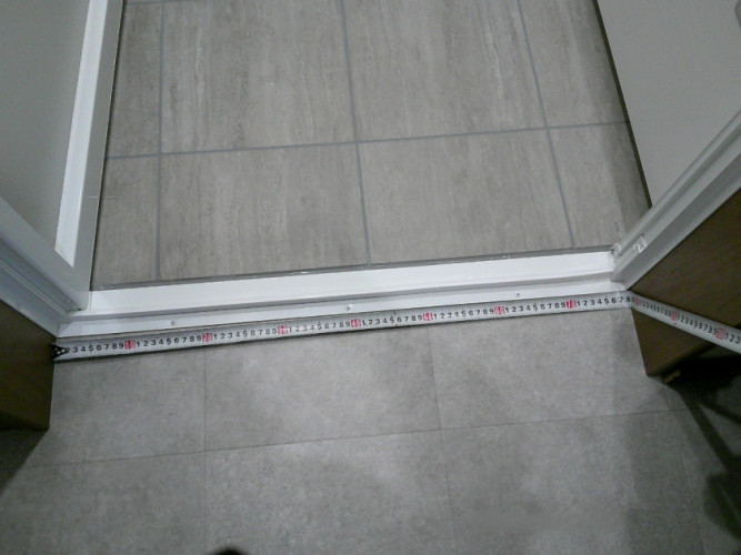 洗濯機パンの配置替えを行い、ドア幅が広いドアを設置する工事をしました。