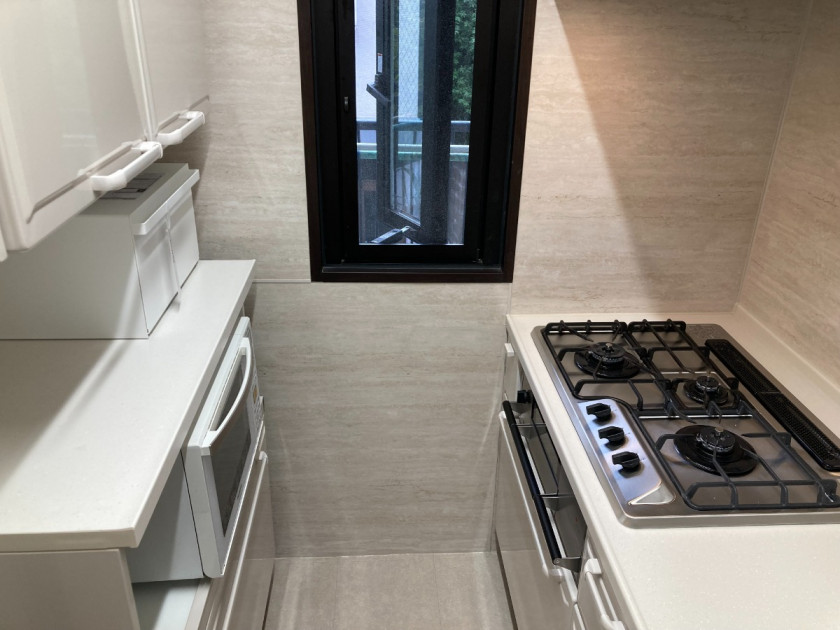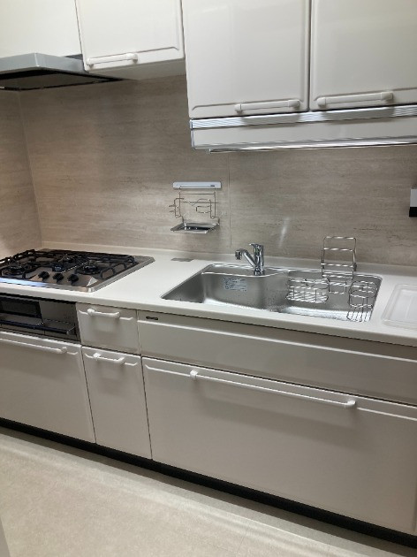 お掃除が楽にできるようキッチンパネルを全面に貼りました。
