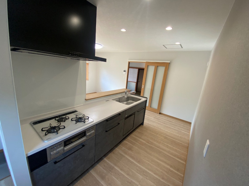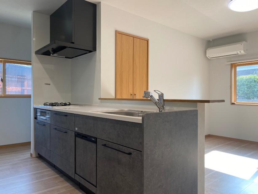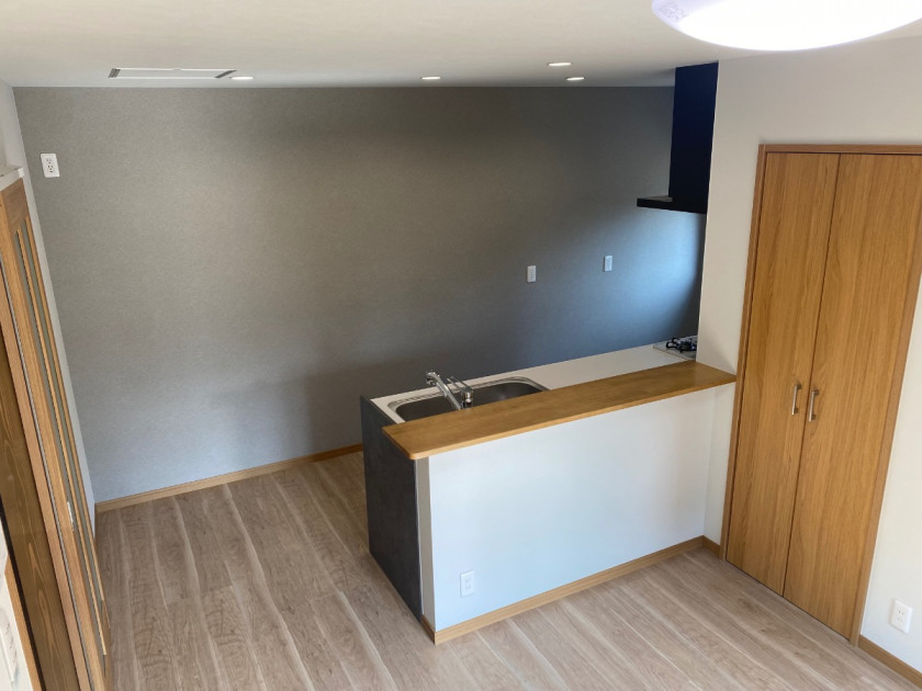 背面のアクセントパネルもグレーにしてキッチンとデザインを統一しました。