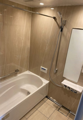 浴室のパネルのデザインを気に入って頂きました。タッチ水栓とダウンライトで豪華な空間になりました。