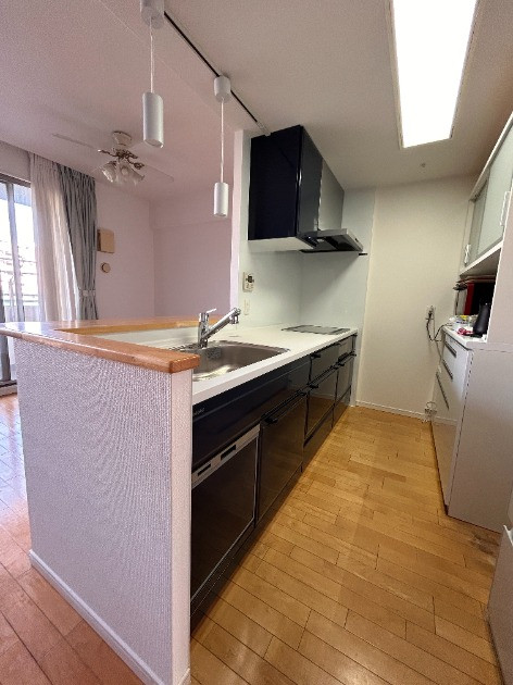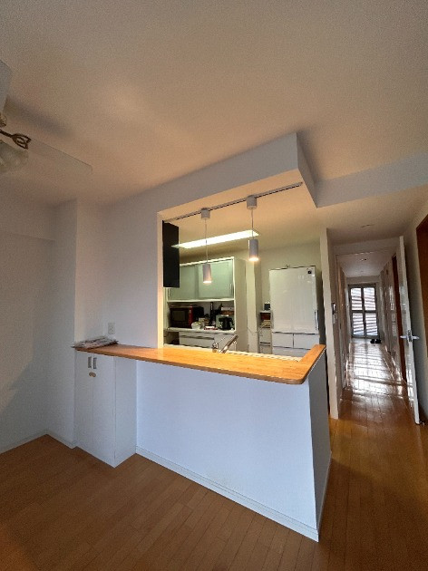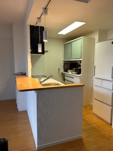 吊戸撤去部にお気に入りのペンダント照明を設置、台所全体が明るくなりました。