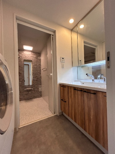 浴室と洗面化粧台に合わせて壁紙・床材を施工。