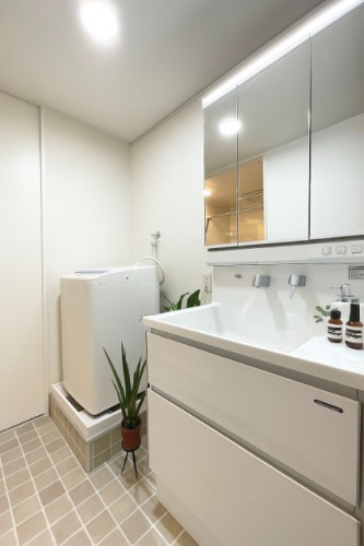 洗面台はとにかく掃除がしやすいフラットな洗面ボウルが魅力の【ファミーユ】を採用。収納力もUPしスッキリと物が収まり余裕のある空間に!奥様のご希望のタイル調クッションフロアと同じ材質で洗濯機台も施工し、色柄が引き立つよう洗面台やクロスは清潔感際立つホワイトで統一しました。シンプルながらも気分が上がるおしゃれな洗面所にお施主様も大変喜んでくださいました♪