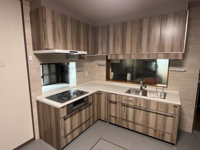 キッチンは通路が狭かったのでキッチンを小さくしてスムーズに通れるようになり、小さくなっても収納力はより整理されて多く入る様になりました。