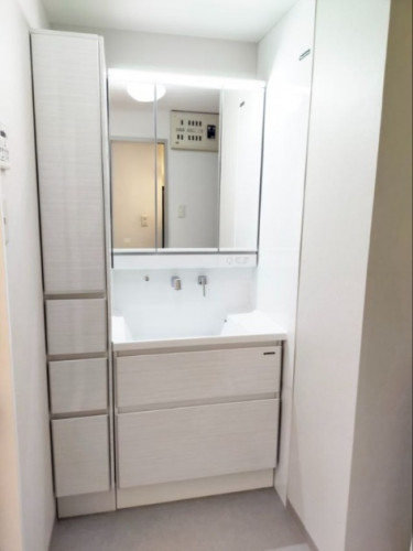洗面台を収納たっぷりのファミーユを採用し、さらに収納を増やす為、洗濯機上部のデッドスペースに可動棚を設置しました。