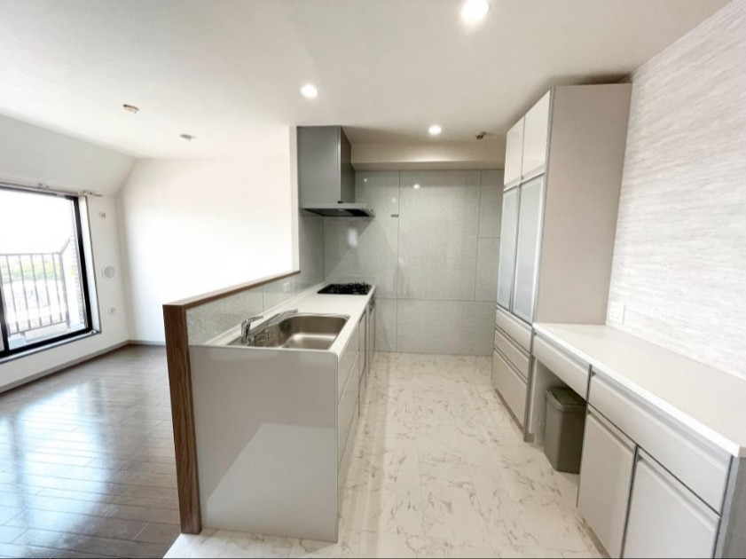 更にキッチンの位置を前に移動し、広いキッチンスペースが実現しました。