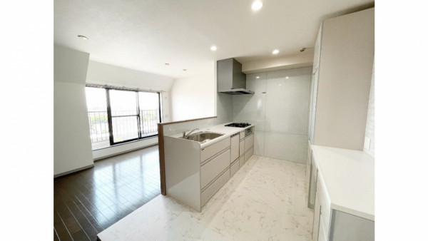 更にキッチンの位置を前に移動し、広いキッチンスペースが実現しました。