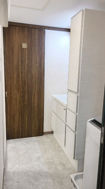 洗面所が暗く狭い事もありリフォームを検討。さらに洗面所の開き戸を引き戸に検討ということでした。