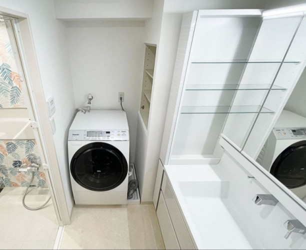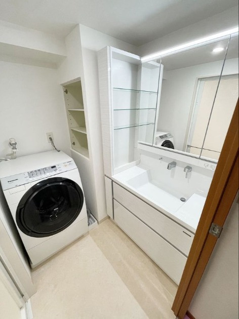 ドラム式洗濯機のサイズが大きいため、洗面化粧台の引出が当たってしまうため、洗濯パンの排水穴の位置をLWからRWに変更し、洗濯機を左寄せに移動することで引出を引き出せるようにしました。