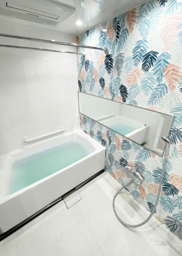 お風呂の壁は南国好きなご主人が即決でボタニカル柄に決定。