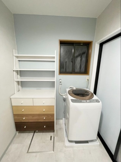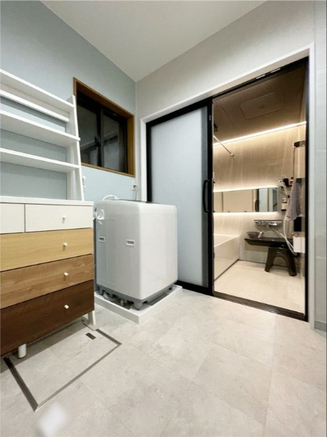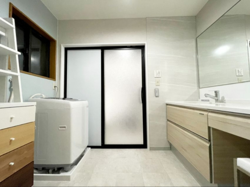 レイアウトを変更し、洗面台と収納を逆転させました。