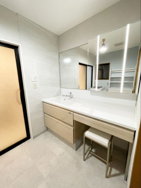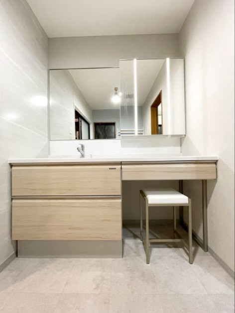 左側は洗面台として、右側はパウダールームとしてご活用していただけます。縦に入ったライトはメイクの時にお顔が明るく照らされ、使い勝手のよい洗面空間が完成しました。