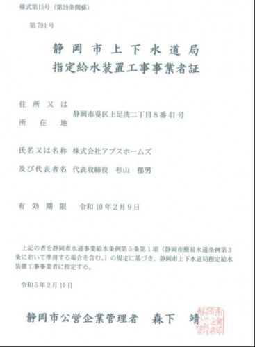 ◇建設業許可・建築士事務所登録・静岡市上下水道局 指定給水装置工事事業者・ガス機器設置スペシャリストのお店 安心な施工をお届します!