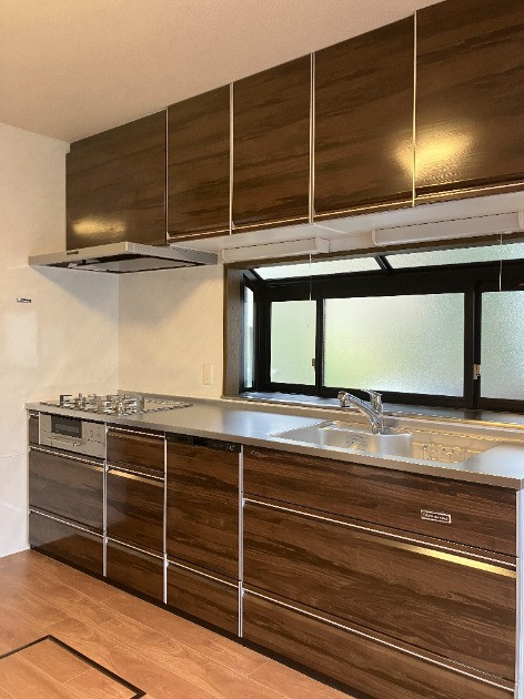 キッチンとカップボードもセットで入替えたので統一感があります。吊戸棚の中には昇降棚を設置、オート調理機能付きガスコンロや食器洗い乾燥機などの家事らく機能も充実して奥様こだわりのキッチンが仕上がりました。