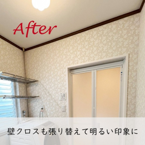 洗面化粧台と同系色の花柄クロスに張り替え、明るく華やかな空間に一新しました✨