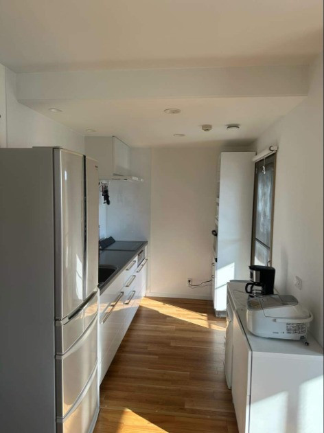 I型に変更し冷蔵庫もキッチンと一直線に配置したことで奥行きが出来、空間が広く明るくなった。