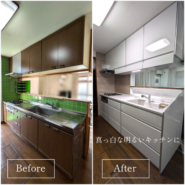 35年前のもので高さも低いため腰が辛かった。収納力を増やしたい!明るいキッチンにしたい!と思いリフォームを決意!引き戸の引き出しになり収納力がアップし、白を基調とした明るいカラーで一気にキッチンが華やかに!キッチン前のカウンターも使いやすくしました。廊下へ出るドアも今後を考え段差のないスライド式に変更しました。