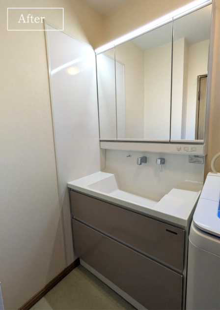 以前の洗面化粧台は使ったあと水栓の周りに水が溜まって見た目も掃除も大変、磨いても落ちず不満がありました。ハイバックタイプのすっきりしたデザインの水栓で見た目もスッキリしとタカラスタンダードのホーロー素材で汚れがつきにくく、水拭きだけで簡単に掃除できます。また3面鏡の収納や、引き出しタイプのキャビネットなど、整理しやすくスッキリきれいな洗面化粧台スペースになりました。