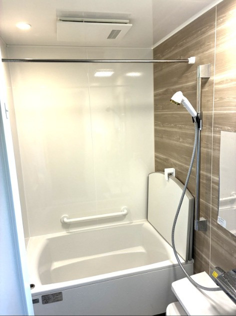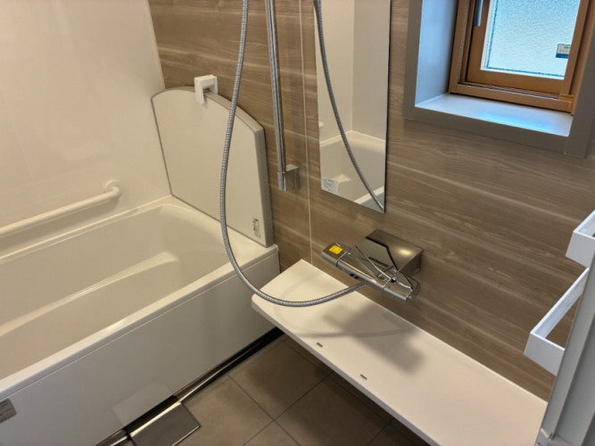 また、全体的に暗かったお風呂場もくつろげない原因の一つでしたので、ホワイト系でご提案、アクセントに木調タイプの