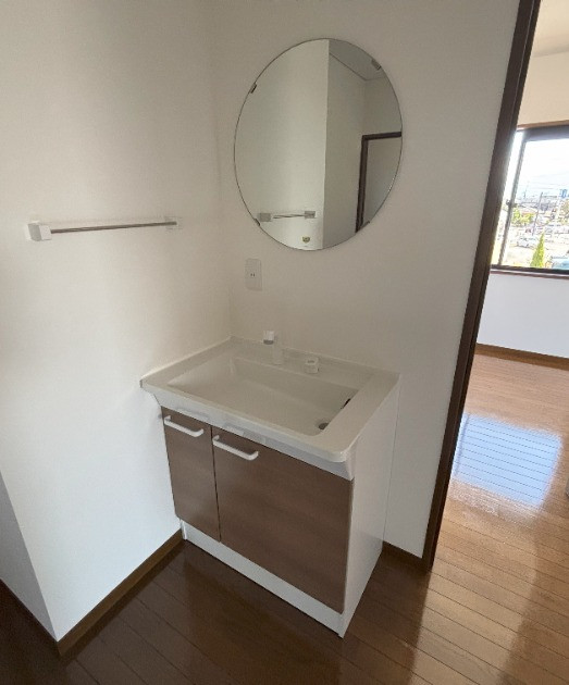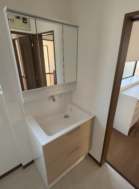 2階は化粧台の使用頻度が低いことから洗面台・鏡のみとし、別途タオル掛けを設置しました。