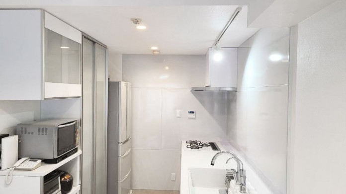 キッチンの閉鎖的になっている壁を抜いて開放することで、空間を広げつつ、事前調査で梁ではなく換気扇のダクトスペースの囲いだった為、必要なダクト範囲まで囲いを作り直し造作。