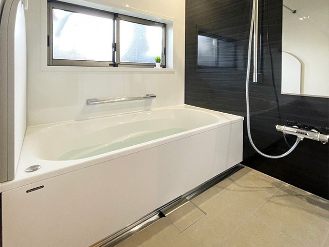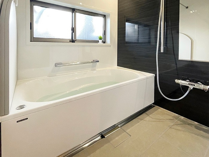 タカラスタンダードのグランスパを採用し、壁にはホーロークリーン浴槽パネルで、傷がつきにくく、マグネットがくっつくため壁収納が可能です。