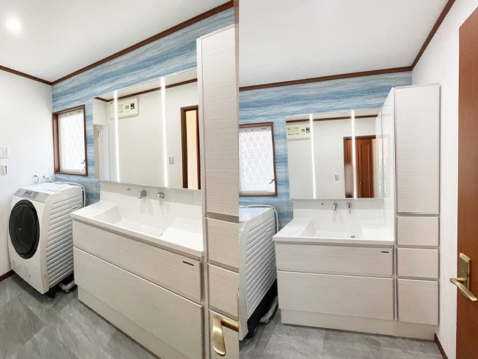 ・洗面台はトールキャビネット+フルスライドで収納確保