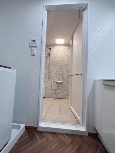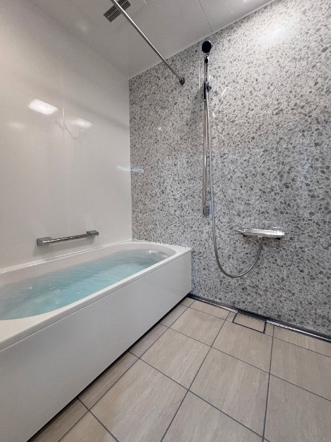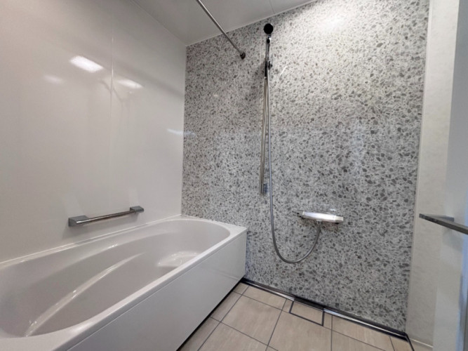アクセントにテラゾー柄を入れることで、シンプルだけどインパクトのある浴室になりました。