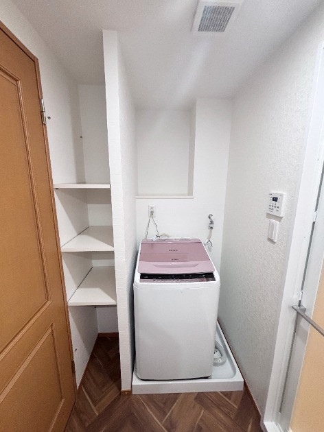 カウンターは水に強い素材を使い、右側壁にもパネルを貼ることでお掃除がしやすくなりました。