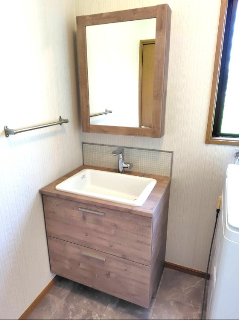 気質のぬくもりを感じられる木目調で、まるで家具のようなオシャレな洗面化粧台に変身しました!