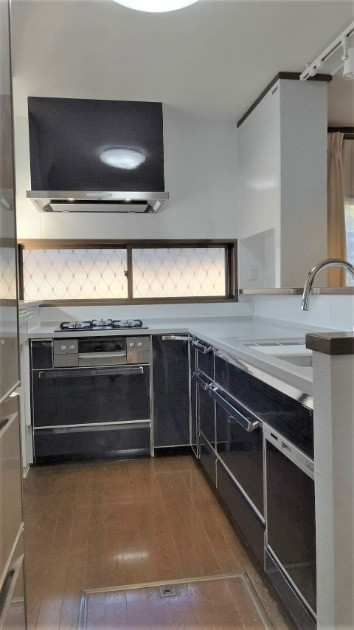 深い色合いのグロスダークブルー扉、光沢もあり高級感があります。作業動線が短く使い勝手の良いL型のキッチン、作業スペースもひろいのでお二人で一緒に料理も楽しめます。