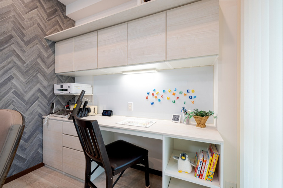 コピー機や固定電話を置いても狭さを感じないシステム収納を取り入れたことで、お子様の荷物や家族の物を効率よく片づけられるようになりました。