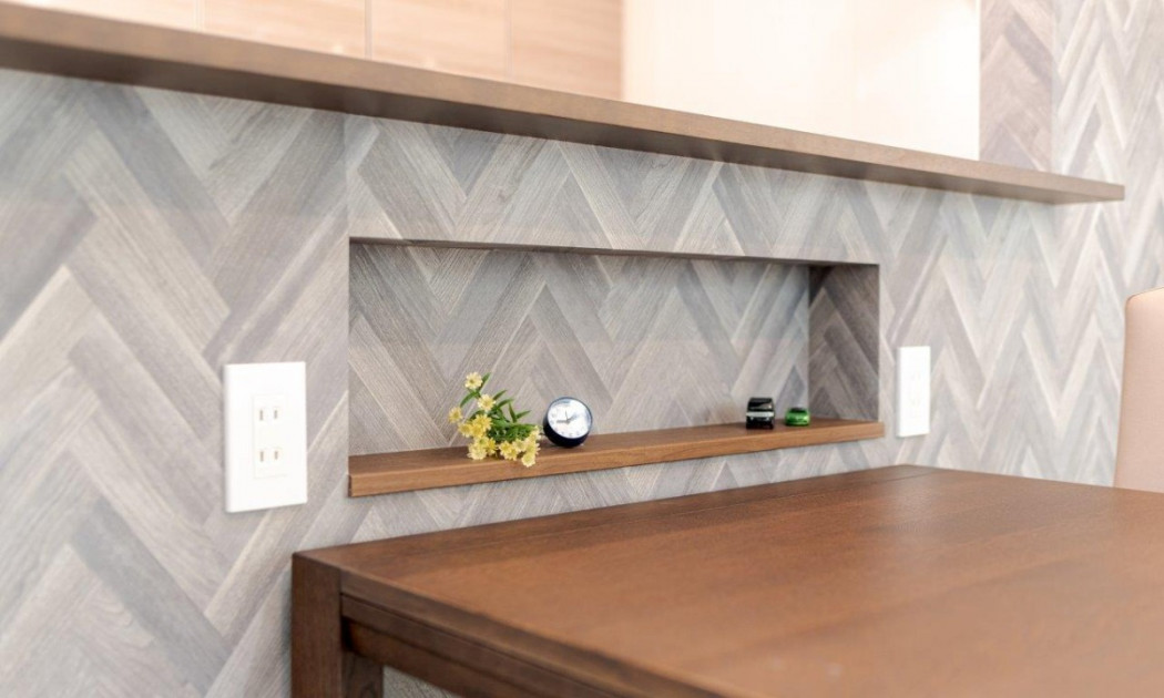 IHコンロ近くの壁には、置き場所に困りがちな調味料を収納できる「くぼみ」を設けています。