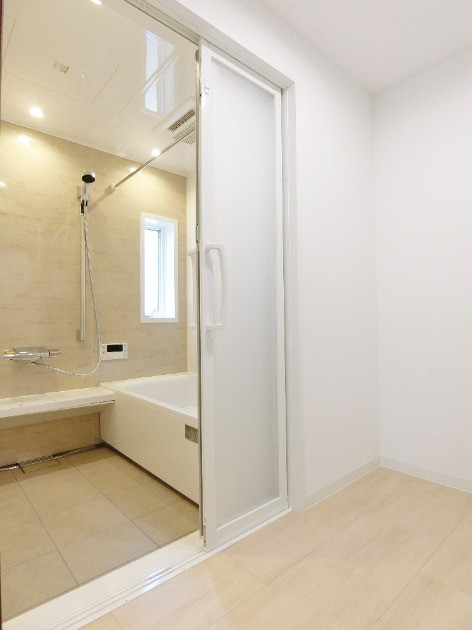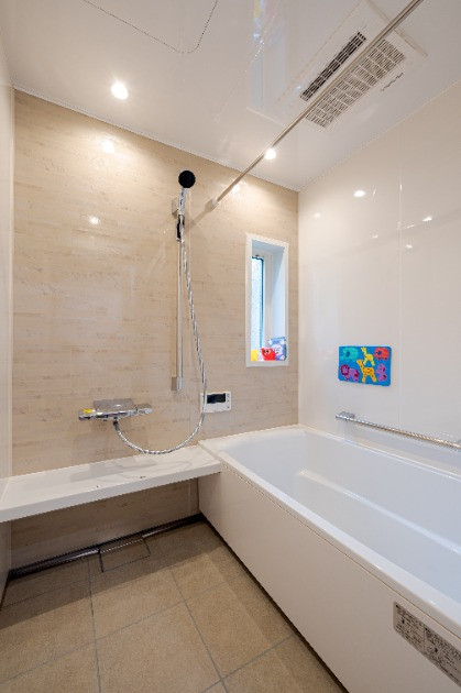 浴室の向きとサイズを変更し、狭さを解消。1317サイズから1416サイズに変わったことで、足を伸ばせるようになりました。窓はYKKPの「マドリモ」によって、外からの目線を遮りながら換気ができる縦すべり出し窓に。壁面には便利なマグネットを搭載しています。市販の収納アイテムを使った「浮かせ収納」も可能です。