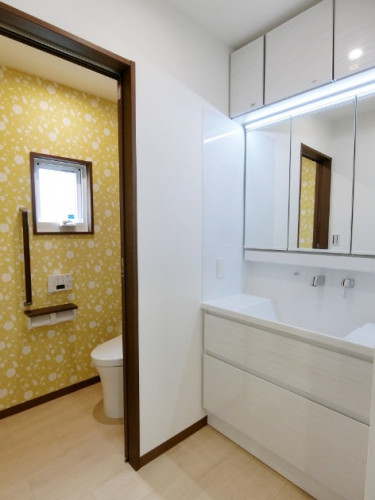2人並んで使えるサイズの洗面台に変更。耐久性に優れているホーロー製の洗面台のため、長く使っても色あせません。また、空間を広く見せるためカラーは清潔感のある白色を採用。三面鏡が更に空間を広く感じさせます。
