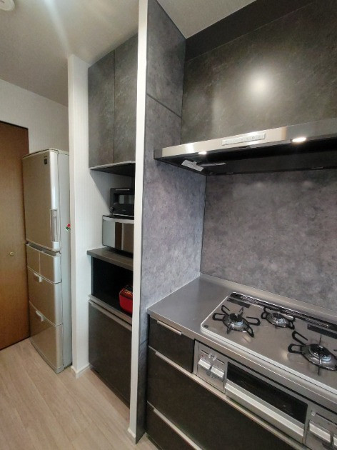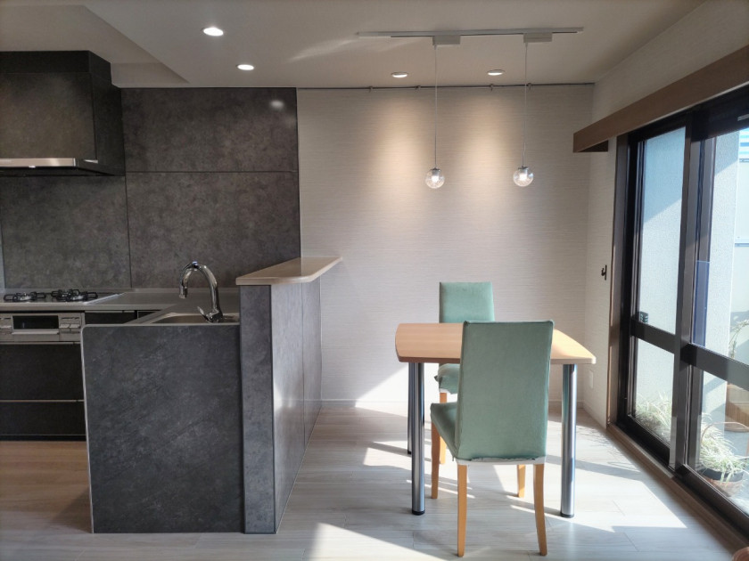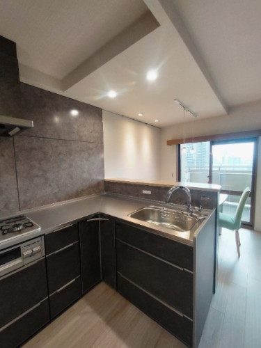 お施主様は対面キッチンと開放感、高級感を希望されていました。そこでキッチンは壁付けI型からL字の対面式とし、吊り戸も撤去しました。現場は高層マンションでシンクで作業しながら、大阪市内の風景が見えるようにしました。また、コンロ前の壁や腰壁にも多くキッチンパネルを施工し高級感を演出しました。