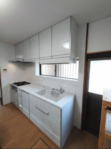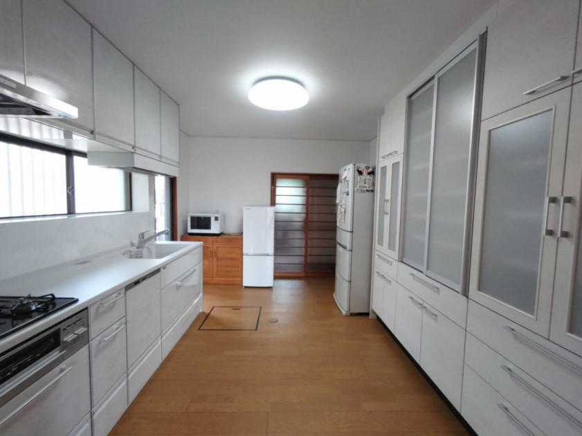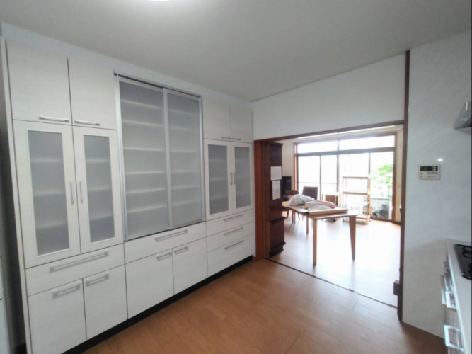 既存水屋には多くの食器があり、また見た目も気にされておられました。そこで壁付けの周辺ユニットを幅240cmの天井までの収納とし、収納量を増やしたスッキリとしたデザインにしました。